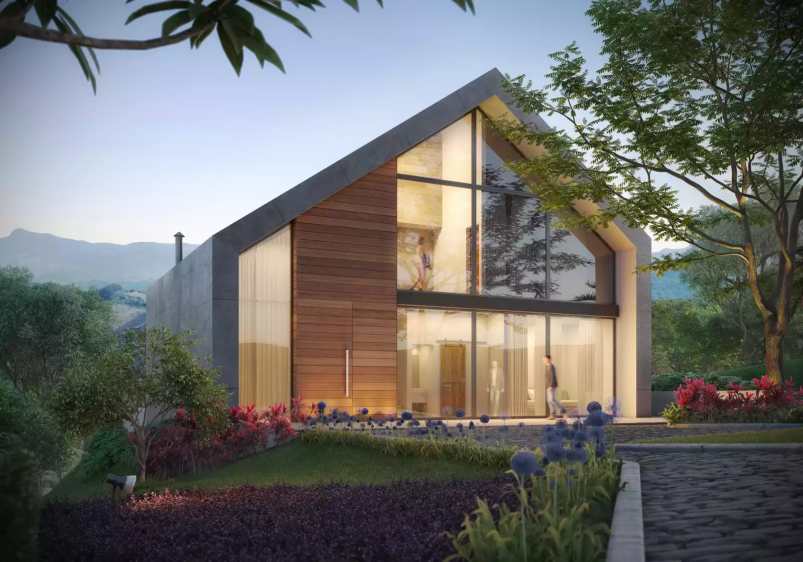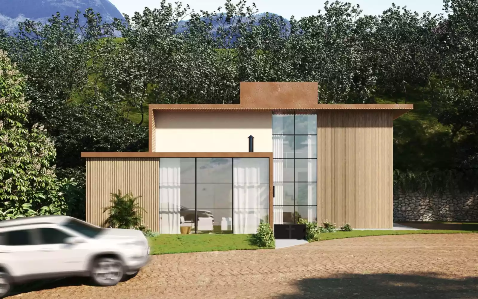 Desenvolvemos um padrão de nossos projetos, onde o pé direito duplo e a valorização dos espaços de convivência são privilegiados, juntamente com a integração de paisagismo e iluminação natural.